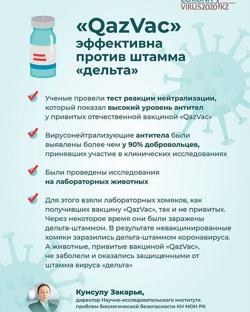 «Qazvac» вакцинасы «дельта» штамынан тиімді қорғайды «QazVac» эффективна против штамма…Қыркүйек 24, 2021